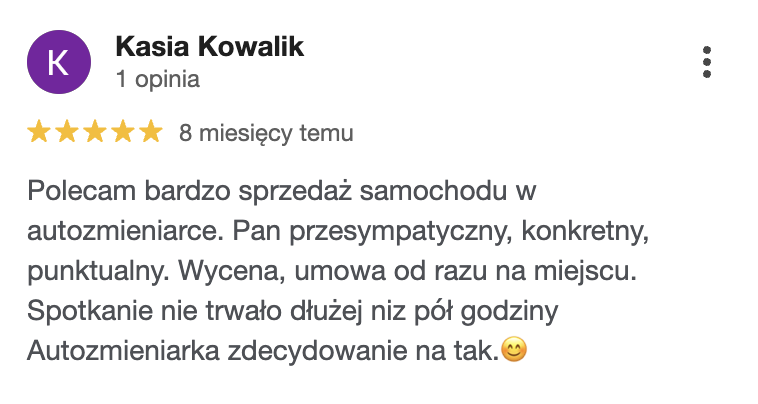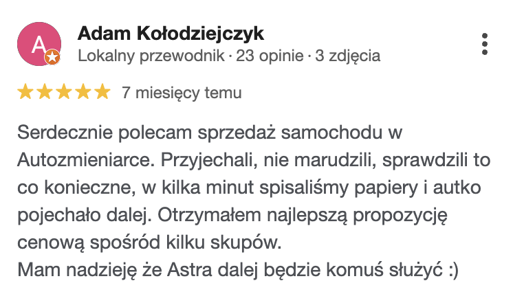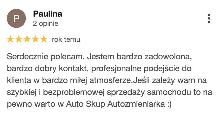 Nasz zespół jest zawsze gotowy, aby przyjechać do Ciebie, dokonać wyceny proponowanego samochodu w wybranym przez Ciebie miejscu i zaproponować za niego uczciwą cenę. Skup Aut Łódź Autozmieniarka to gwarancja profesjonalizmu i niezawodności, co potwierdzają liczne opinie w wizytówce Google wystawione przez zadowolonych klientów. Od momentu pierwszego kontaktu aż po finalizację transakcji, dbamy o to, abyś czuł się pewnie i komfortowo. Wybierając nasz Auto Skup Łódź, masz pewność co do jakości transakcji.